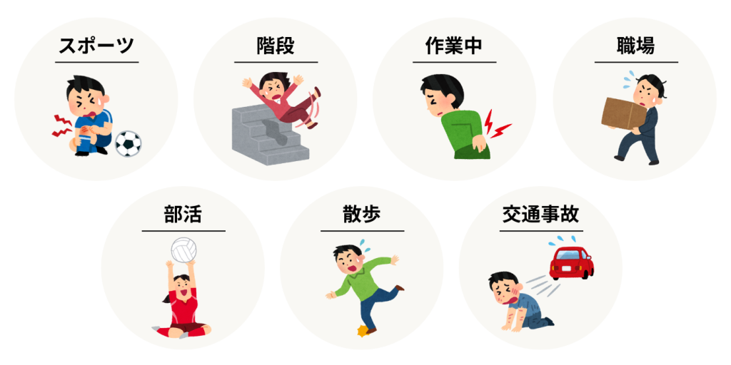 主にスポーツによるケガ、日常生活や職場でのアクシデント、交通事故などが原因となることが多く見られます。